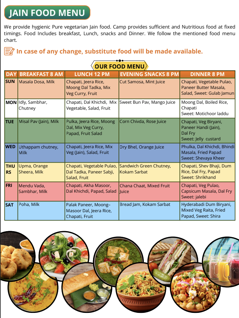 | Wednesday | Uthappam, Chutney, Milk | Chapati, Jeera Rice, Mix Veg (Jain), Salad, Fruit | Dry Bhel, Orange Juice | Phulka, Dal Khichdi, Bhindi Masala, Fried Papad, Sweet: Shevaya Kheer |